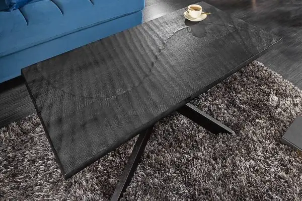 Tischplatte besteht aus massivem Mangoholz, welches ein schwarzes Finish erhalten hat und zudem mit einem in aufwändiger Handarbeit gestaltetem 3D Muster versehen ist. So wirkt die gesamte Tischplatte besonders plastisch und lebendig. Das schwarze Metallgestell greift den herben Look der