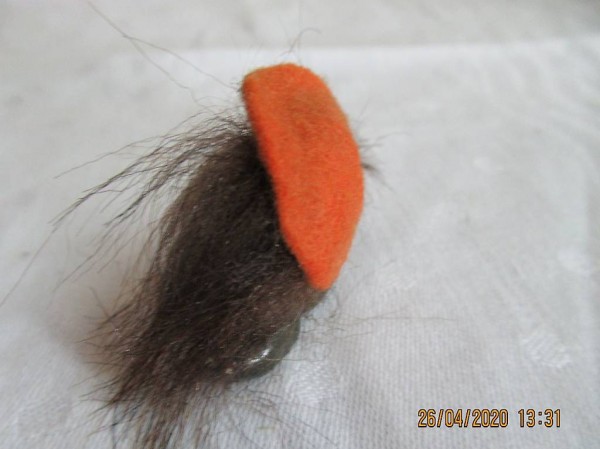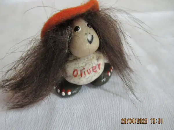mit der Aufschrift Oliver, lange echte Haare, und einen gefilzten Hut, so ein Hippy, war einst beim Geburtstag die