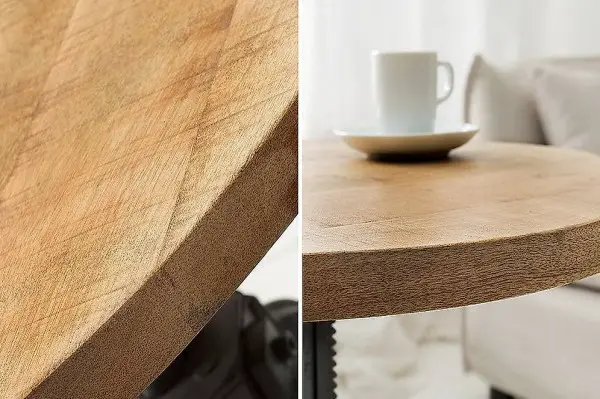 Suchen Sie auch das Aussergewöhnliche? Dann ist dieser Couchtisch mit einer Tischplatte aus Mangoholz genau das Richtige für Sie. Das Mangoholz wurde in hochwertig verarbeiteter Bohlenoptik designt. Dadurch wirken die leicht abgerundeten Bohlen gemeinsam als einzigartige Tischplatte mit tollen, haptischen Eigenschaften. Das Untergestell aus grob gearbeitetem Eisen ist aufwändig gestaltet, mit einer hölzernen Drehkurbel und elegant geschwungenen Beinen. Sie unterstreichen das mattierte Design der Eisenkonstruktion, welches sich perfekt in den rauen Industrial Stil einfügt.