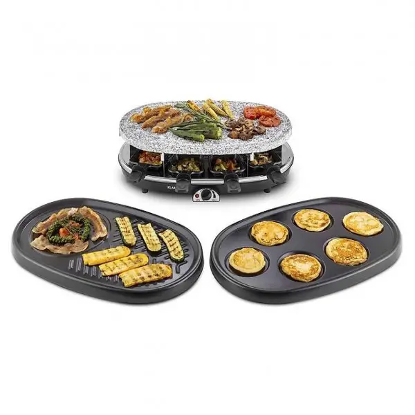 Grillplatte mit stufenloser Temperaturregelung, finden acht Pfännchen Platz zum Braten, Überbacken und Schmelzen von Käse und vielem mehr.