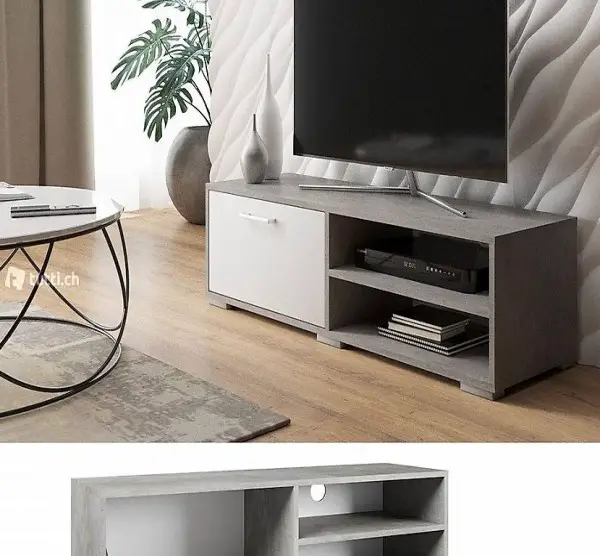 Das praktische Lowboard präsentiert sich in einem geradlinigen, zweifarben Design und fügt sich