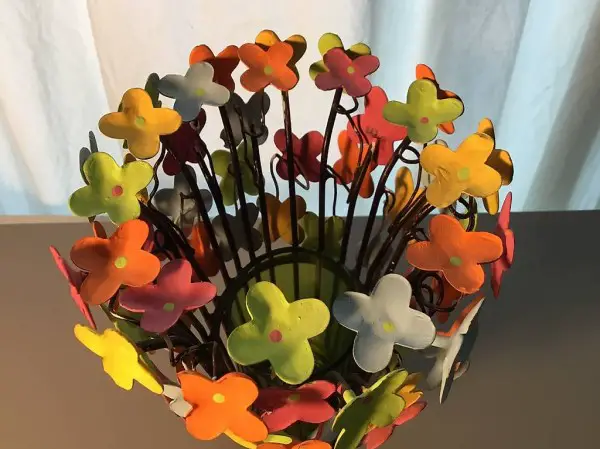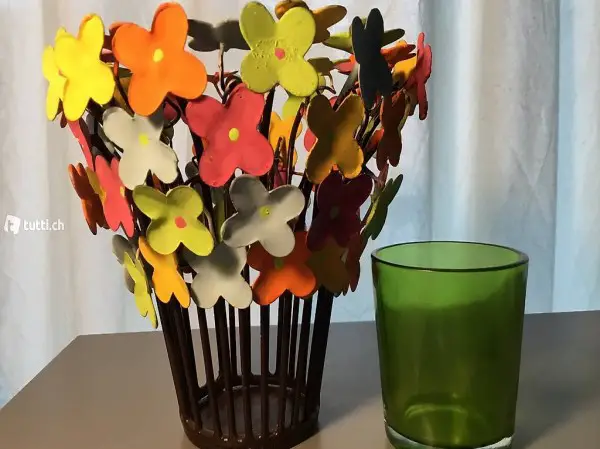 Die handbemalten Metallblumen wirken wie ein Blumenstrauss.
