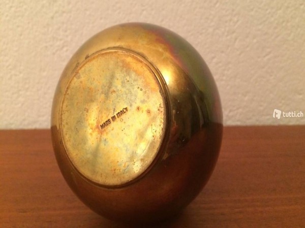 Spezielle vintage Dekovase oder Flasche aus den vierziger oder fünfziger Jahren. Die Blumenvase besteht aus Messing welches feingliedrig gestaltet und sehr gut verarbeitet ist. Die 40-er 50-er Messingvase hat eine schöne Patina und ist in gutem Zustand. Die mid century Vase hat als kleine Besonderheit einen Bendel um den Hals welcher auch aus Messng besteht. Das Messingväschen ist auf der Unterseite gemarkt mit made in Italy. Zur 1940er 1950er Vase gehört ein passender Korken - ob der original dazugehört sei mal dahingestellt.