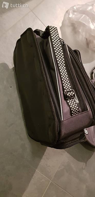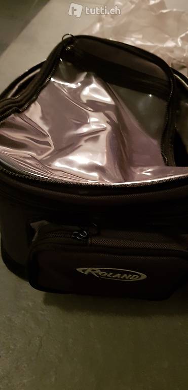 Reissverschluss an Basis fixiert wird, und Schutzhaube für Regen. Basis hat 3 Seitentaschen. Basis bietet Platz für etwa 8 Liter, Aufsatz für etwa 4 Liter. Sehr praktisch für längere Fahrten, da somit auf einen