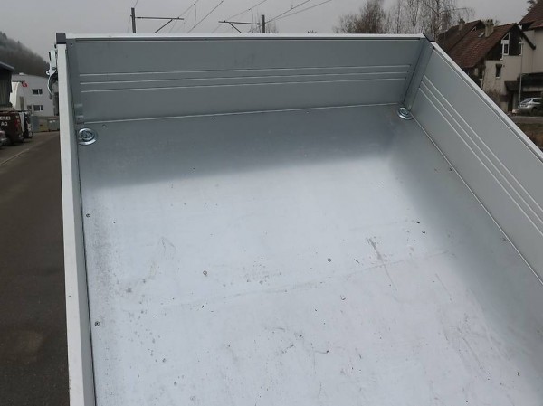 Stahlblechboden feuerverzinkt auf Stahlrahmen, 4 Binderinge auf Boden. Alu-Bordwände 30cm hoch, alle vier Wände abklapp- und abnehmbar, alle 4 Eckpfosten abnehmbar.