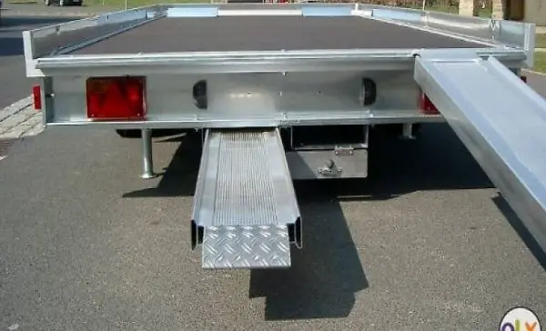 Hochladeranhänger mit Niederfahrwerk 13" (Stahlfelgen). Gesamtgewicht 3500kg, Nutzlast ca. 2750kg, Innenlänge 410cm, Innenbreite 200cm, Innenhöhe 10cm. Abnehmbare Seitenwände, Stirnwand fest. Stabiles verzinktes Fahrgestell,