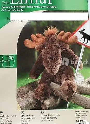 Fertig genähter Elch aus hochwertigem Plüsch.