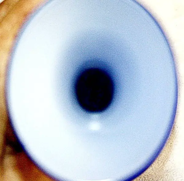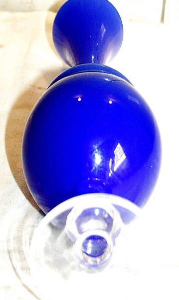 Es ist eine superschöne Glas-Vase innen weiss, aussen Blau, H: 26cm, Öffnung: 6-1,5cm. Bitte beachten Sie, dass man beim Glas färben nur mit flüssigem Kobold ein so intensives Blau erreichen kann.