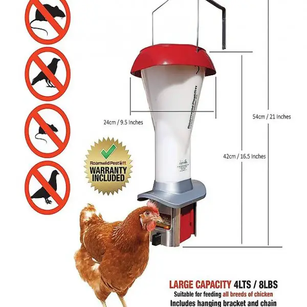 Edelstahlkette und einem Haken zum einfachen Aufhängen. Futterspender enthält Garantie zur Schädlingsabwehr - SPART Geld, da KEINE VERSCHWENDUNG vorkommt und nur die Hühner gefüttert werden, aber keine hungrigen Schädlinge!