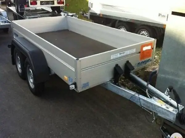 Tandemachser mit Auflaufbremsen und Rückfahrautomatik, wartungsfreie Gummifederachsen, V-Deichsel. Aluminiumwände, hintere abklappbar, Siebdruckholzboden. 12-Volt