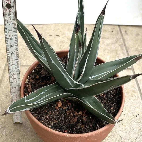 Agave ferdinandi-regis auch als "König der Agaven" genannt; atemberaubende kleine langsam wachsende Agave mit einer offenen Rosette von dreieckigen blau-grünen Blättern mit schmalen länglichen weissen, dreieckigen Prägungen, die Ränder der Blätter sind dunkelrotbraun und stachellos.