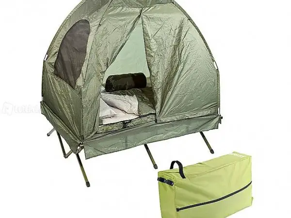 Zelt inklusive Camping-Liege, Luftmatratze und Luftkissen, 2 Schlafsäcke, Zeltstangen, Heringe, Seile, Luftpumpe, Tragetasche und deutscher Anleitung