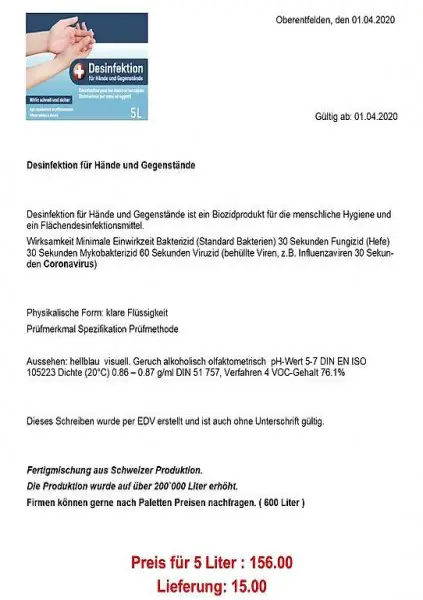 Wegen sehr grosser Nachfrage von diesem Desinfektionsmittel wurde die Produktion auf 200`000 Liter erhöht.