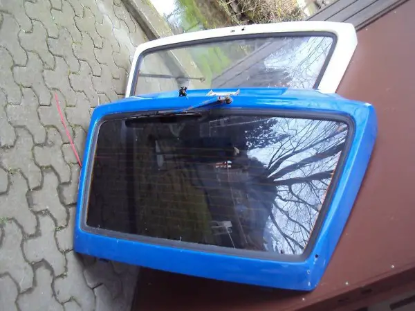 Heckdeckel von VW Golf 2. Blau, Scheibe getönt, Löcher von Spoiler, kein Rost. Weiss, Rostansatz unter Scheibengummi, Falz i.O.