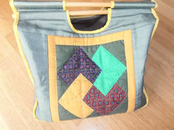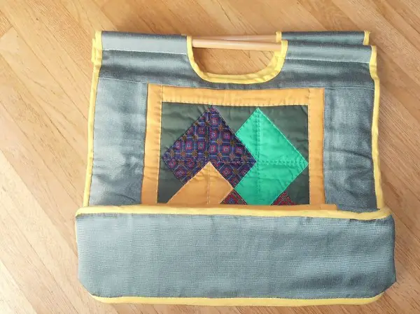 Schöne selbstgenähte Tasche in Patchworklook mit Holzgriffen und Kartonboden.
