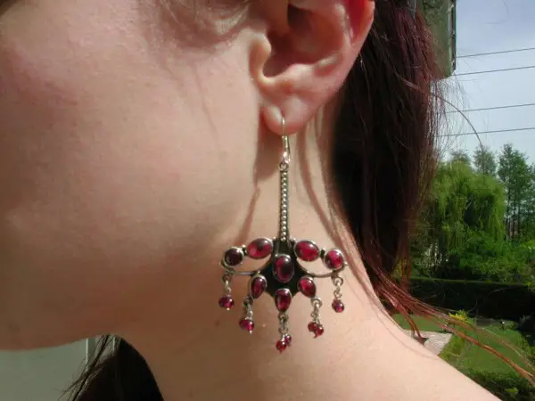 Une belle paire de Boucles d'Oreilles. Chaque Boucle est ornée de 8 Grenats cabochons ovales (6x8 mm.), ronds ou en goutte , ainsi que de 10 perles en Grenat également.