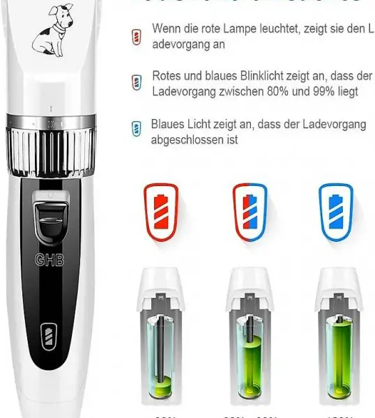 2 Lithiumbatterie- Der Tierhaarschneider enthält zwei leistungsstarke Lithium-Batterien und ist leicht zu ersetzen.Die Schnellladung dauert nur 1,5 Stunden,um vollständig aufgeladen zu werden. Zwei Originalbatterien, damit Sie GHB Tierhaarschneider lange Zeit nutzen können