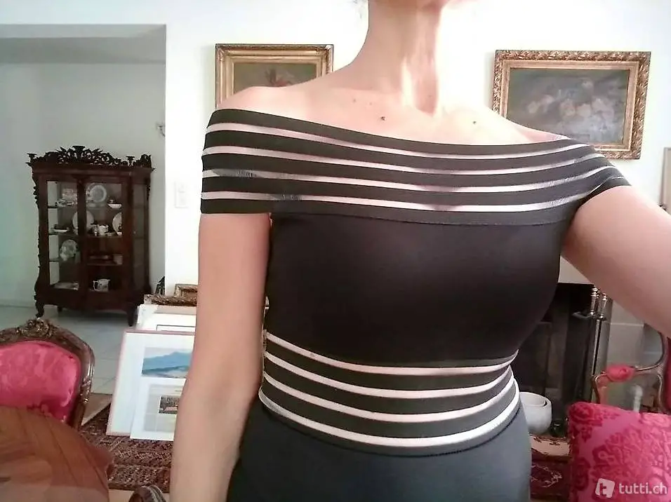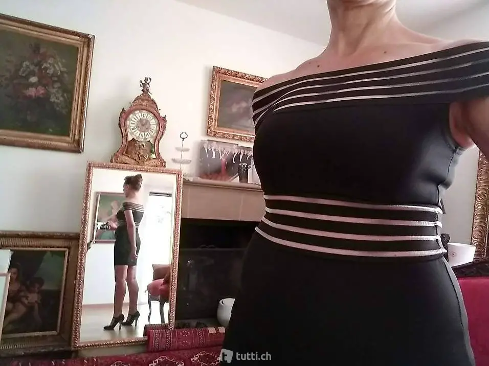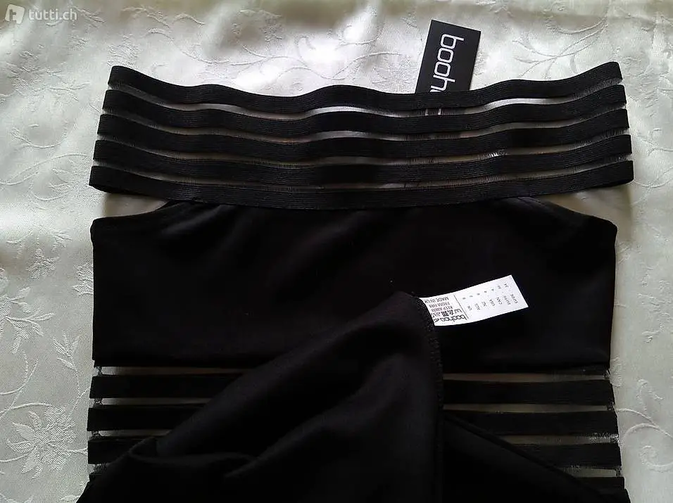 Minikleid von Marke Boohoo (UK). Das Kleid ist an 2 Stellen mit breitem Gummiband bearbeitet. Es sitzt sehr hautenh. Das Material ist dehnbar. Durch das Gummiband kann man es schulterfrei tragen. Das Kleid macht sehr schöne Figur, ist sehr elegant und sexy. Es ist neu und ungetragen (nur für Foto habe ich angezogen).