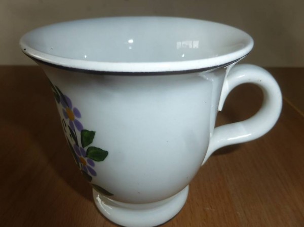 Eine Tasse (d=10,5 cm) mit Henkel und Spruch ?Ich gratulire?; mit einer blauen, einer roten und zwei violetten Blumen; Tassenunterseite "Viller" & Boch, SCHRAMBERG?