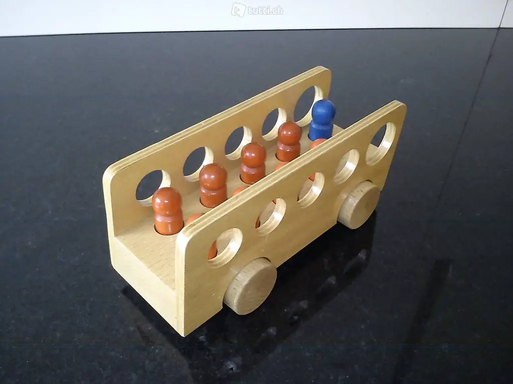 Holz Spielzeug Bus mit 9 farbigen Mannögeln, 8 x rot und 1 x blau.