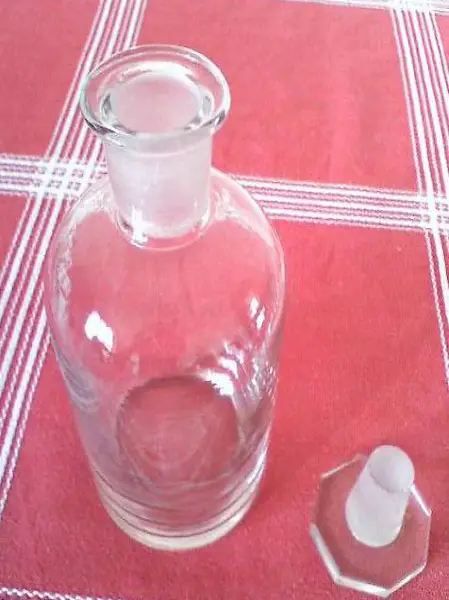 Apothekerflasche, transparent Glas, DM 7cm, Höhe 16cm, Gravur T. 340,0, Deckel 8-eckig (winzige Beschädigung), Zapfen geschliffen, Gravur 25