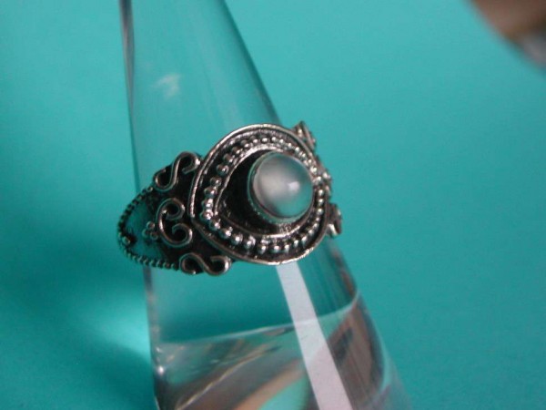 En Argent de qualité, c'est un joli bijou, finement travaillé, estampillé du poinçon de titre 925 (argent sterling) et de mon poinçon de garantie déposé à Berne. La bague est ornée d'une Pierre de Lune ou Moonstone Blanche, pierre véritable garantie.