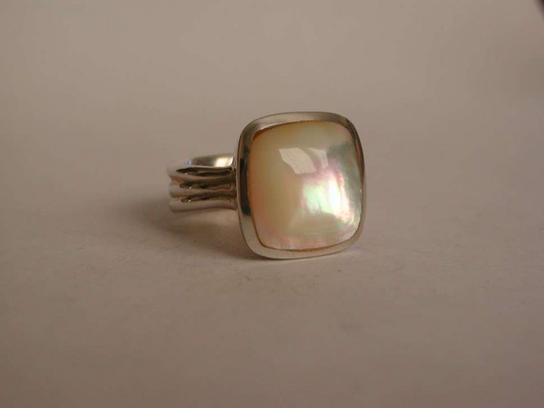 Cette bague se compose d'un solide anneau, orné d'un magnifique cabochon de Nacre Blanche (MOP Mother of Pearl). Estampillé du poinçon 925 et de mon poinçon de garantie déposé à Berne.