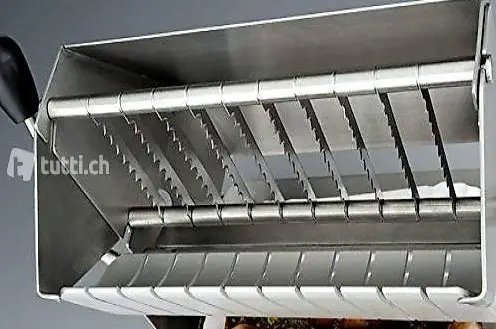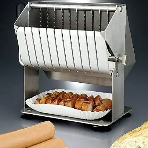 Hand Currywurstschneider robust und leicht zu handhaben Gehäuse aus Chromnickelstahl Messer aus Edelstahl manuel bedienbarer Schneidehebel Bodenplatte mit Saugfüssen für hohe Standfestigkeit flexibel einsetzbar platzsparend pflegeleicht Scheibenstärke 17 mm Abschnitte 11 Stück Arbeitsbreite 205 mm