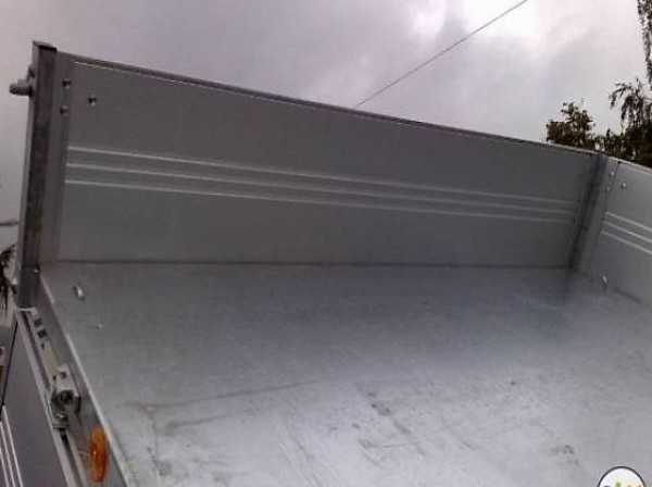 3mm Stahlboden feuerverzinkt, seitlich bis unter die Brücke umlaufend mit 4 Binderingen, Sicherungsstütze, Alu-Bordwände eloxiert 36cm, alle vier Wände abklappbar, hinten auch pendelbar, alle 4 Eckpfosten abnehmbar