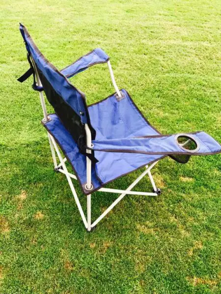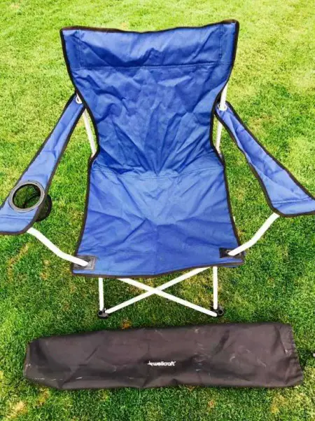 Faltstuhl Wellcraft, blau, mit Getränkehalter, aufgeklappt und zusammengelegt in Sekunden, keine Montage erforderlich, Sitzhöhe 45cm, Höhe 90cm, Tiefe 45cm, 100% Polyester, robustes Stahlgestell, ca. 3,8 kg, inklusive Transportbeutel, neuwertig.
