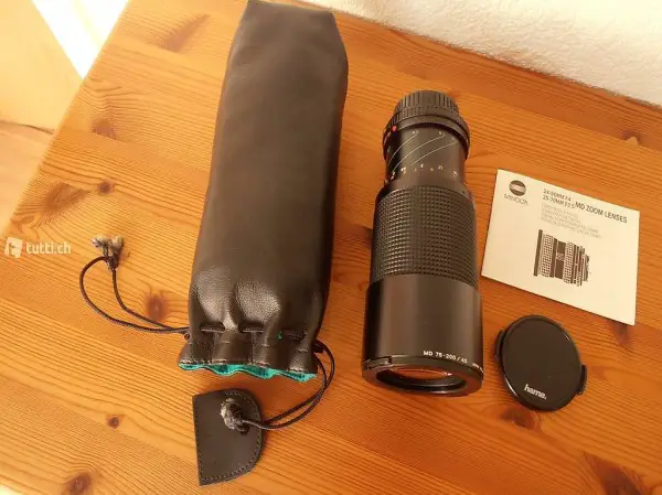 Teleobjektiv von Minolta 75-200mm mit Schutzhülle und kleinem Büchlein "Schärfentiefen-Tabelle".