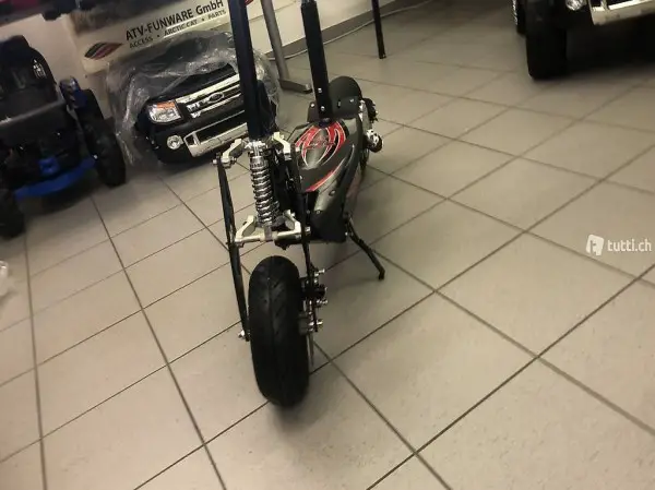 Lieferumfang:Im Lieferumfang ist das Ladegerät und ein kleines Werkzeugset, sowie die englische Bedienungsanleitung enthalten. Das Trotti ist weitgehend vormontiert, Lenker, Vorderräder, Kettenspannung sowie ein paar andere Kleinteile müssen noch festgeschraubt bzw. kontrolliert werden. Der Zeitaufwand für die Endmontage liegt bei knapp 2 Stunden. Selbstverständlich können wir dies gegen einen Aufpreis von Fr. 70.00 für Sie erledigen.