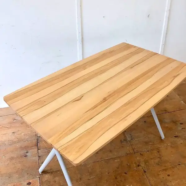 Holzmaserung. Matt lackiert. Metallgestell Unterbau, Pulverbeschichtet. Umlackiert in der richtigen Farbe bestimmt recht elegant. 160 x 95cm Höhe 74cm. Die Längskanten mit leichtem Radius. Weitere