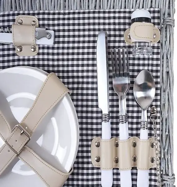 Teller | Porzellan-Tassen | Edelstahl-Besteck | Halterungen für alle Utensilien | Seitlicher Tragegriff | Mit