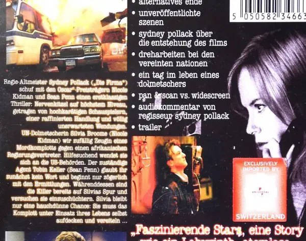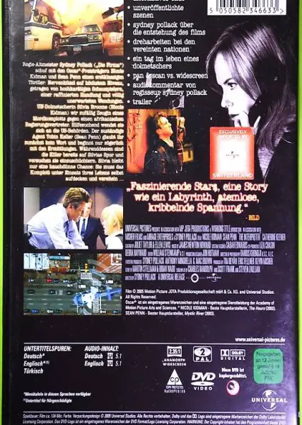 Übersetzung. - Pech, wenn man zufällig Zeugin eines Mordkomplotts wird. - Die Dolmetscherin, Silvia Broome (Nicole Kidman) schwebt plötzlich in grosser Gefahr. - Lesen Sie bitte auch die Beschreibung auf der dritten Foto.