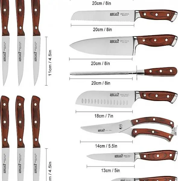 MESSERSET FÜR JEDEN ANWENDUNGSBEDARF: 1x8 "Kochmesser(20cm),1x8 "Brotmesser(20cm), 1x8 "Schnitzmesser(20cm), 1x5 "Allzweckmesser(13cm), 1x7"Santokumesser(18cm), 6x4.5"Steakmesser, 1x5.5"Haushaltschere(14cm), 1x8"Wetzstahl(20cm), 1x3,5 "Schälmesser(9cm), 1x