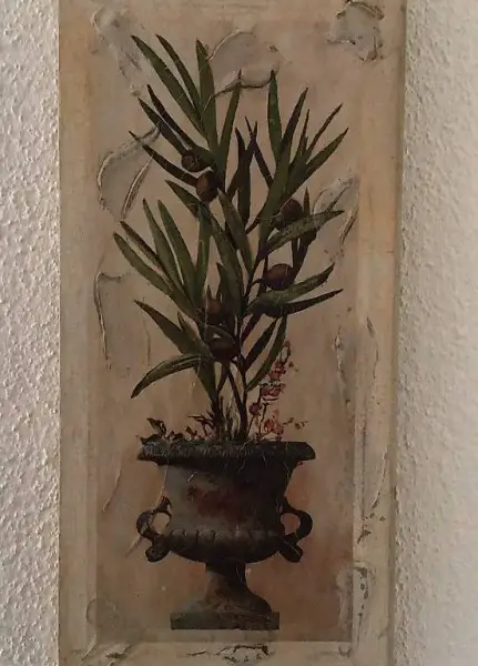 ... ca. 70jährig, aus rauchfreiem Raum. Spezielles Pflanzen-Motiv, siehe Foto. Aufgezogen auf Holzrahmen. Höhe 46,5 cm, Breite 26 cm, Tiefe 1,5 cm. Reliefartig bemalt in weichen Farbtönen.