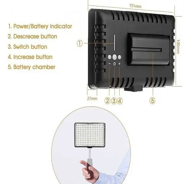 LED Video Licht: 3200K / 5500K doppelte Farbtemperatur mit orangefarbenen und klaren Filtern; stabile Farbtemperatur auch bei langen Stunden, Vervollständigen Sie einfach qualitativ hochwertige Fotografie-Produkte; Die Helligkeit der LED-Kamera kann von 10% bis 100% eingestellt werden, Helligkeit von jedem LED-Kamera-Licht-Panel kann bis zu 950LM, um die höhere Foto-Nachfrage zu erfüllen; Lange Lebensdauer bis zu 50.000 Stunden; Eine Akkulaufzeit beträgt ca. 90 Minuten.