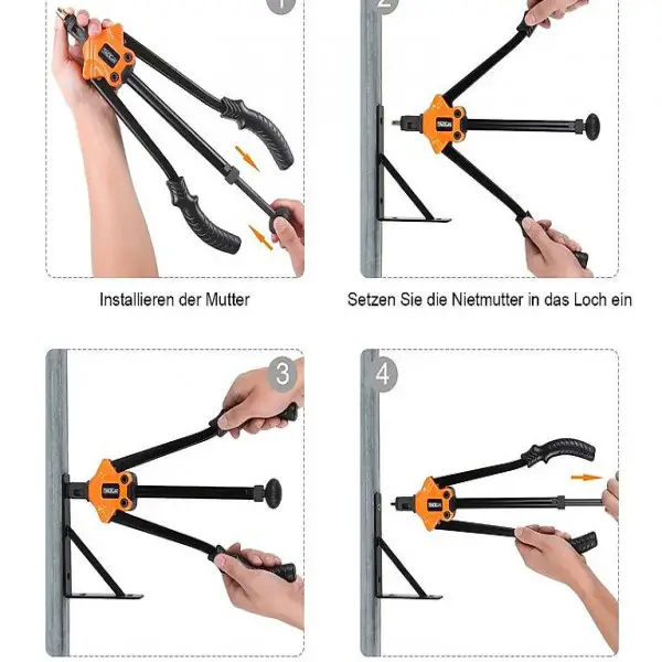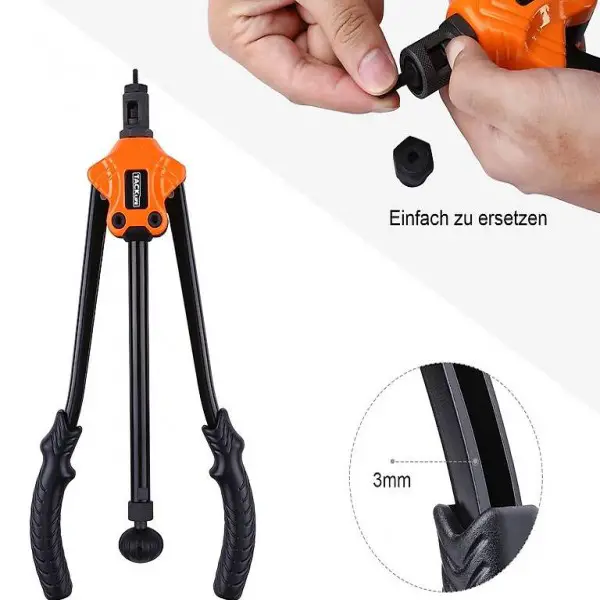 Nietzange mit einer Länge von 360mm, der 3 mm dicke Arm aus Kohlenstoffstahl maximiertdie Hebelwirkung und spart 40% Ihrer Anstrengung, Ergonomische Griffe mit Doppelverbundscharnieren zur Verbesserung der Haltbarkeit. Diese Nietmutternpistole verwendet Chrom-Molybdän-Stahldorne mit 3/25 "(3 mm) hochfesten Griffen, die die Gerät robuster und haltbarer machen