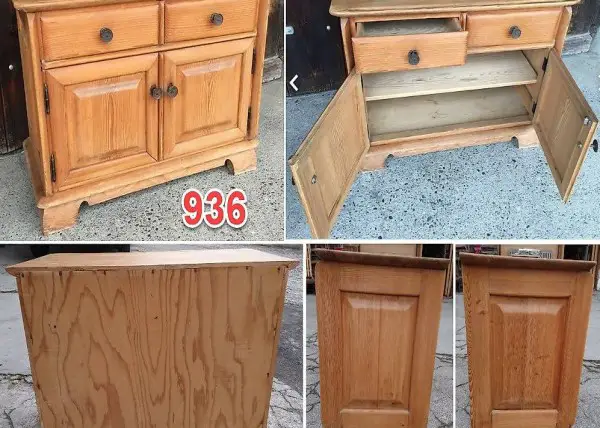 3 Schubladen und 2 Türen mit Schlüssel (funktioniert), ein Tablar.