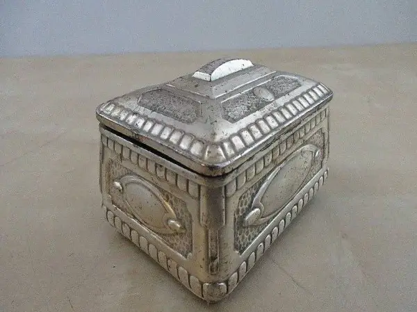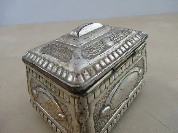 Herzige kleine versilberte Dose. Alter, Zweck und Herkunft unbekannt. Masse ca. 11x8 x 7 cm.