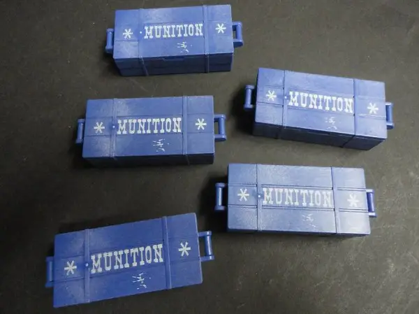 Die blauen Gewehrkisten wurden ebenfalls nie bespielt, sind neuwertig und in bestem Zustand. Sie dienten bloss zur Ausstattung und Ergänzung grösserer