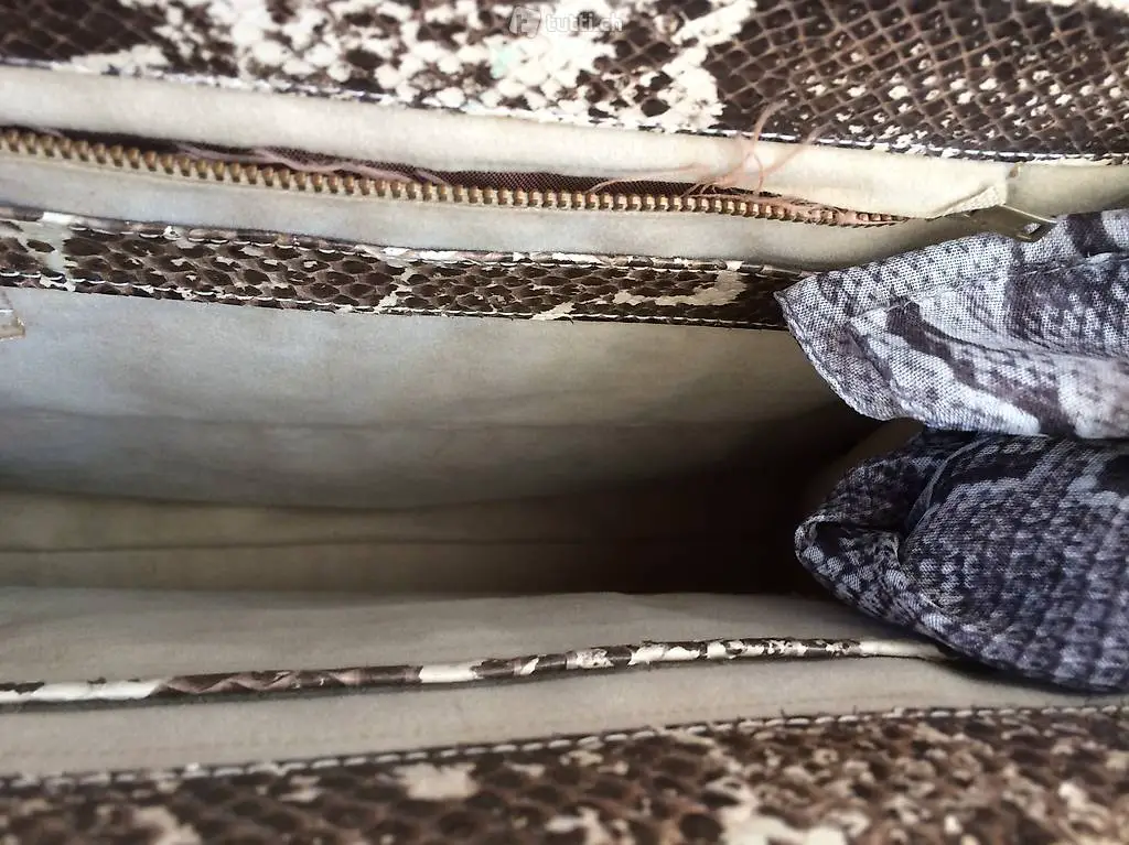 Vintage Tasche aus echten Schlangenleder. Aus den 50iger Jahren. Grösse ca 34x25 cm. In gutem Zustand, nur ist leider das Schloss herausgefallen (dieses müsste ersetzt oder repariert werden)
