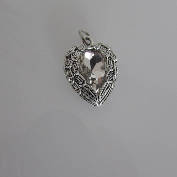 Neues, silberfarbenes Herz mit klarem, funkelndem, facettiertem Glasstein, eingefasst von zwei Engelflügel
