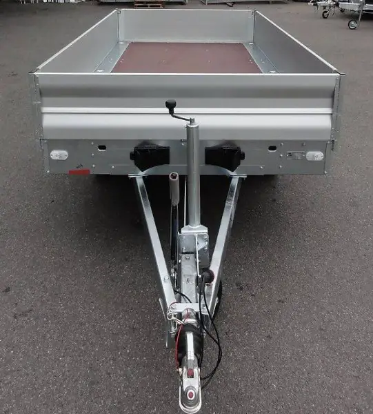 Tandemachser mit wartungsfreien Gummifederachsen, Auflaufbremse mit Rückfahrautomatik, V-Deichsel, 50mm Kugelkupplung, Stützrad in der Mitte montiert