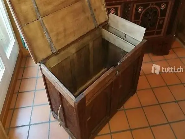 Uralte Truhe, schätzungsweise über 300 Jahre alt. Schloss und Schlüssel sind nicht drin. Die vermutlich gotische Truhe mit typischen spitzen Deckel ist in einem hervorragendem Zustand und schätzungsweise über 300 Jahre alt.