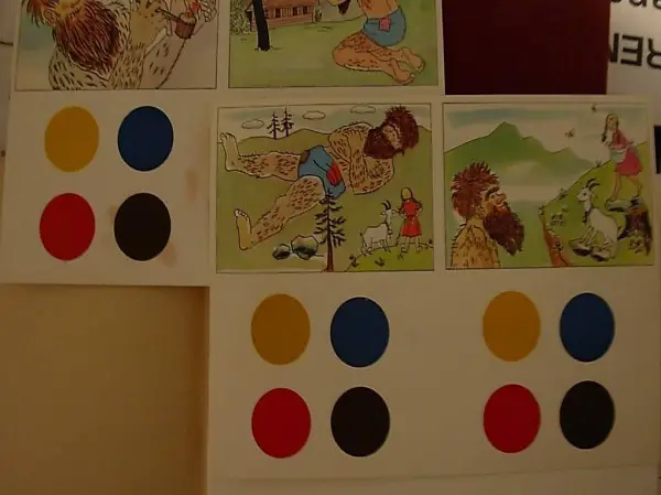 Verzierte Original-Broschur, mit 6 ganzseitigen Bildern von Marion Diethelm zum Ausmalen, beigelegt drei Original-Bogen mit sechs farbigen Bildern zum Nachmalen und die dazugehörigen Farben auf Bogen zum sofortigen Gebrauch mit feuchtem
