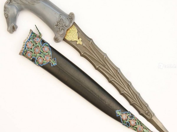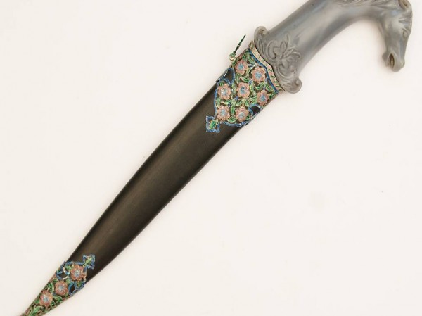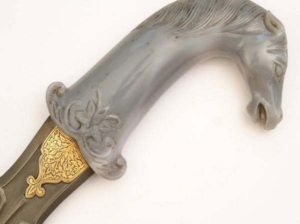 Griff aus blauem Chalzedon, Knauf in Form eines Pferdekopfes