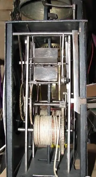 Uhrwerk (2 Hämmer) ist nicht signiert, jedoch die sehr hohe Aufhängung am Seidenfaden, die feinen Originalzeiger und dem Pendel hinten ist eine Bauweise, welche nur zwischen 1750 und 1775 gebaut wurde, also eine der ersten 2 Zeiger-Standuhren, die je gebaut wurde. Das Werk wurde frisch revidiert für 1800 CHF.