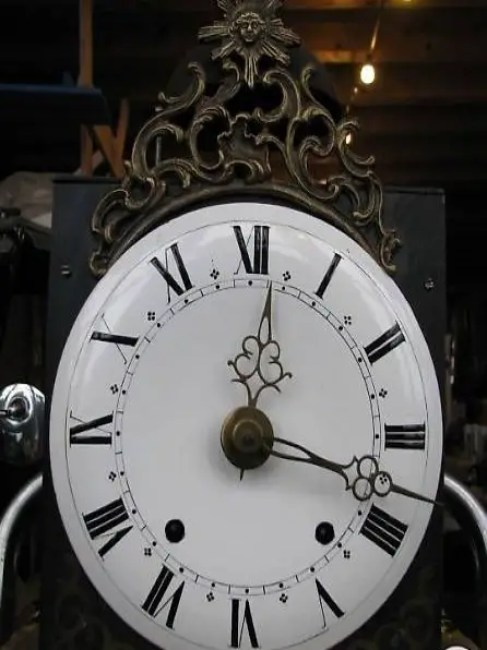 Was hier angeboten wird, ist ein wunderschönes Stück der Uhrmacherei mit einem schlichten Tannenuhrkasten (H 205, B 42, T 26 cm). Die Front ist eine typische ?Roi soleil? (Sonnenkönig) aus Messing, schlichtes Zifferblatt emailliert. Der Pendel der ganz alten Comtoise-Standuhren ist hinter den 2 Gewichten und 2 Aufzügen, dies mit einer langen Aufhängung am Seidefaden. Dieses 1 Glocken-